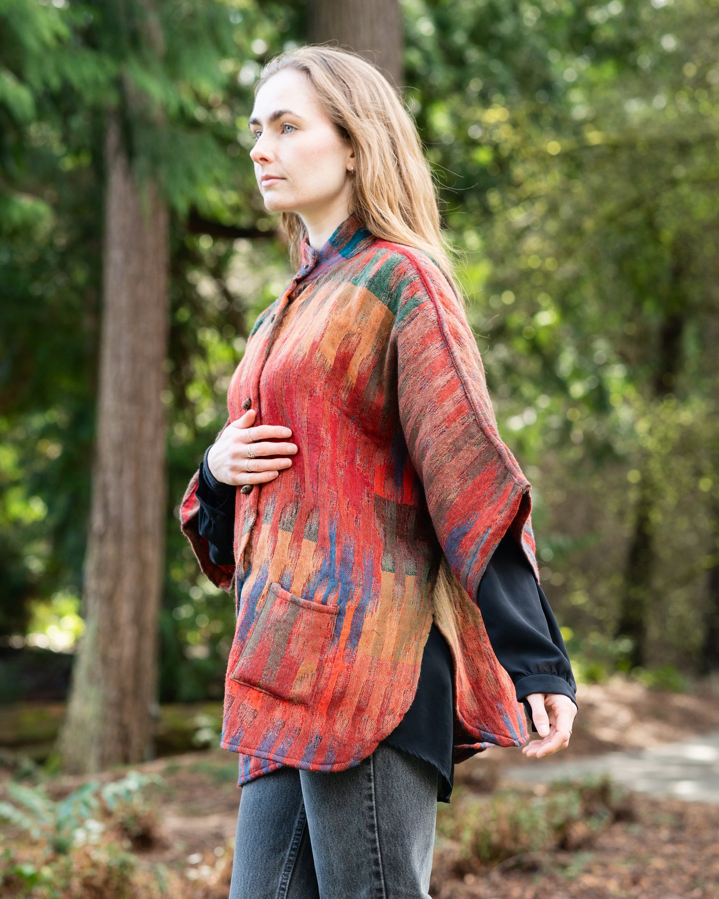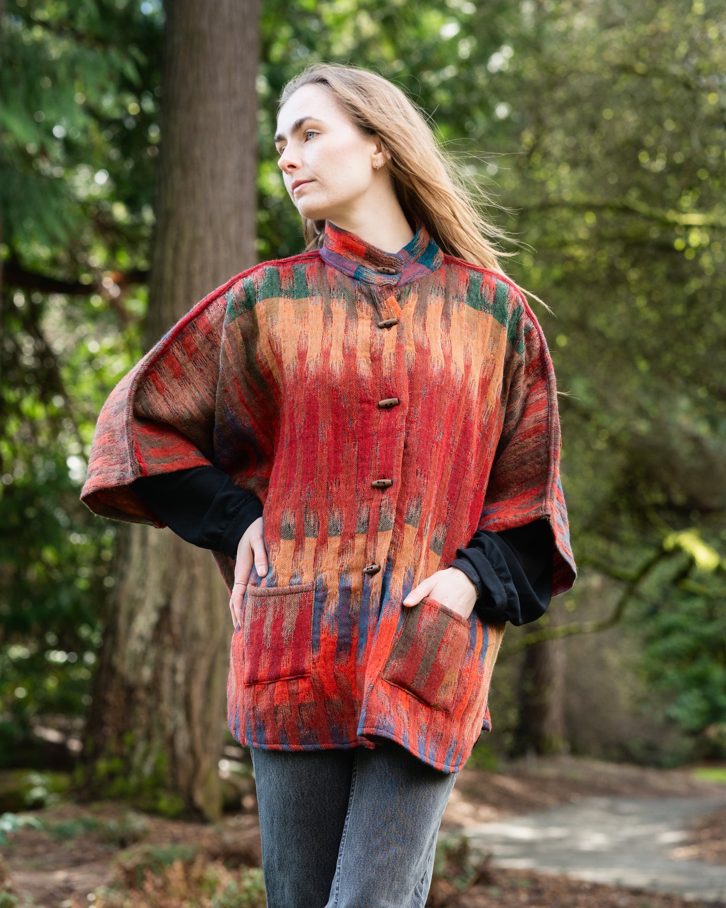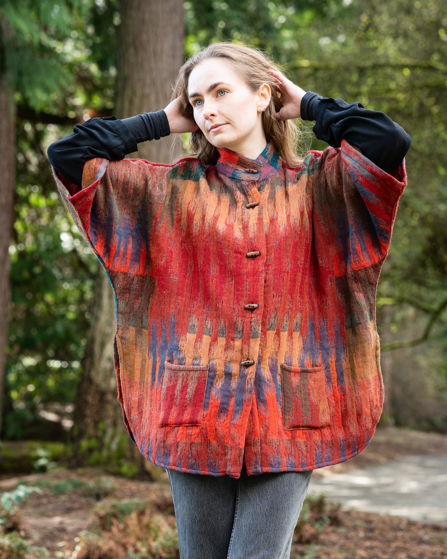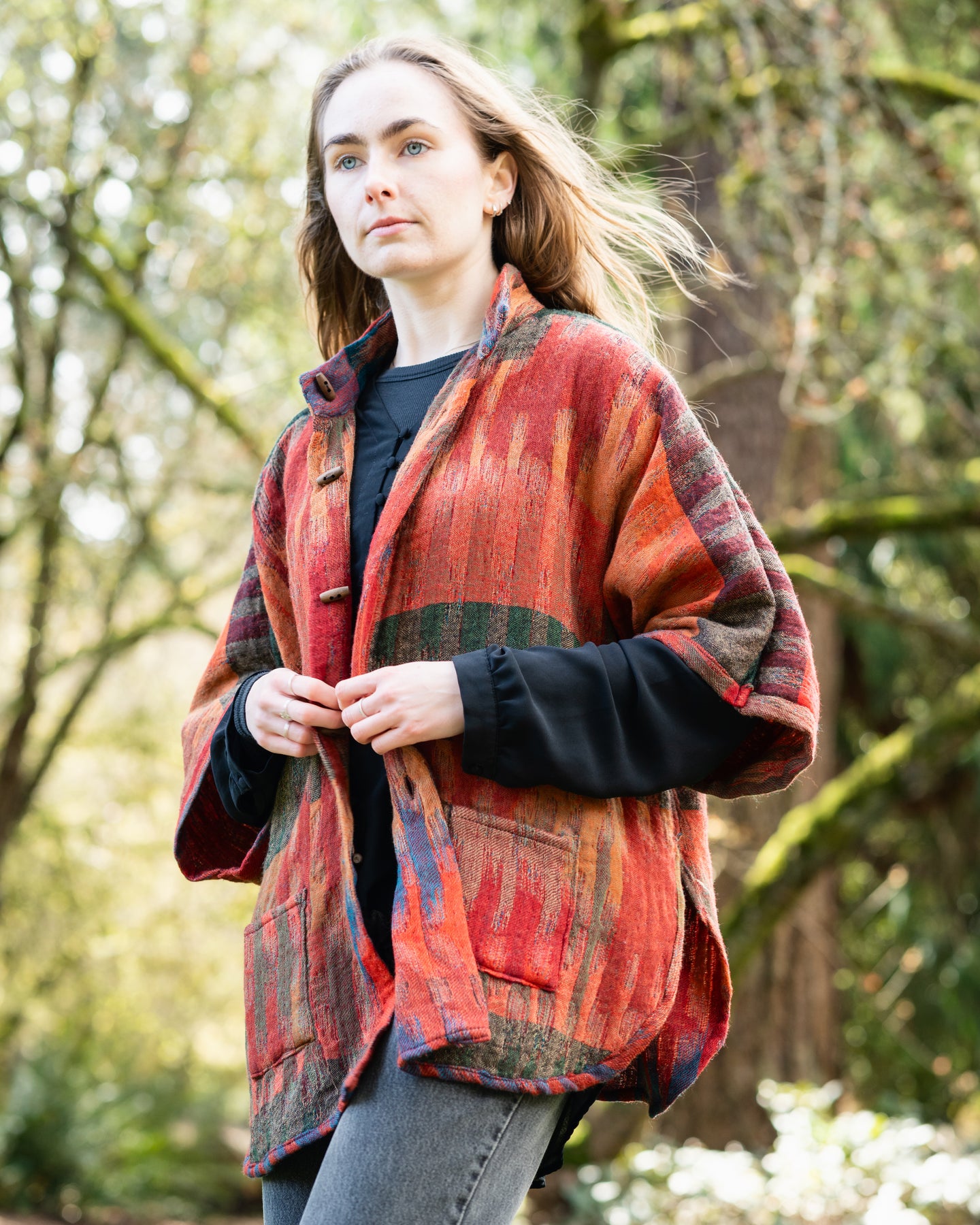Reversible Merino Wool Kimono Jacket in Morocco Green with wooden and shell buttons, pockets, and oversized fit.