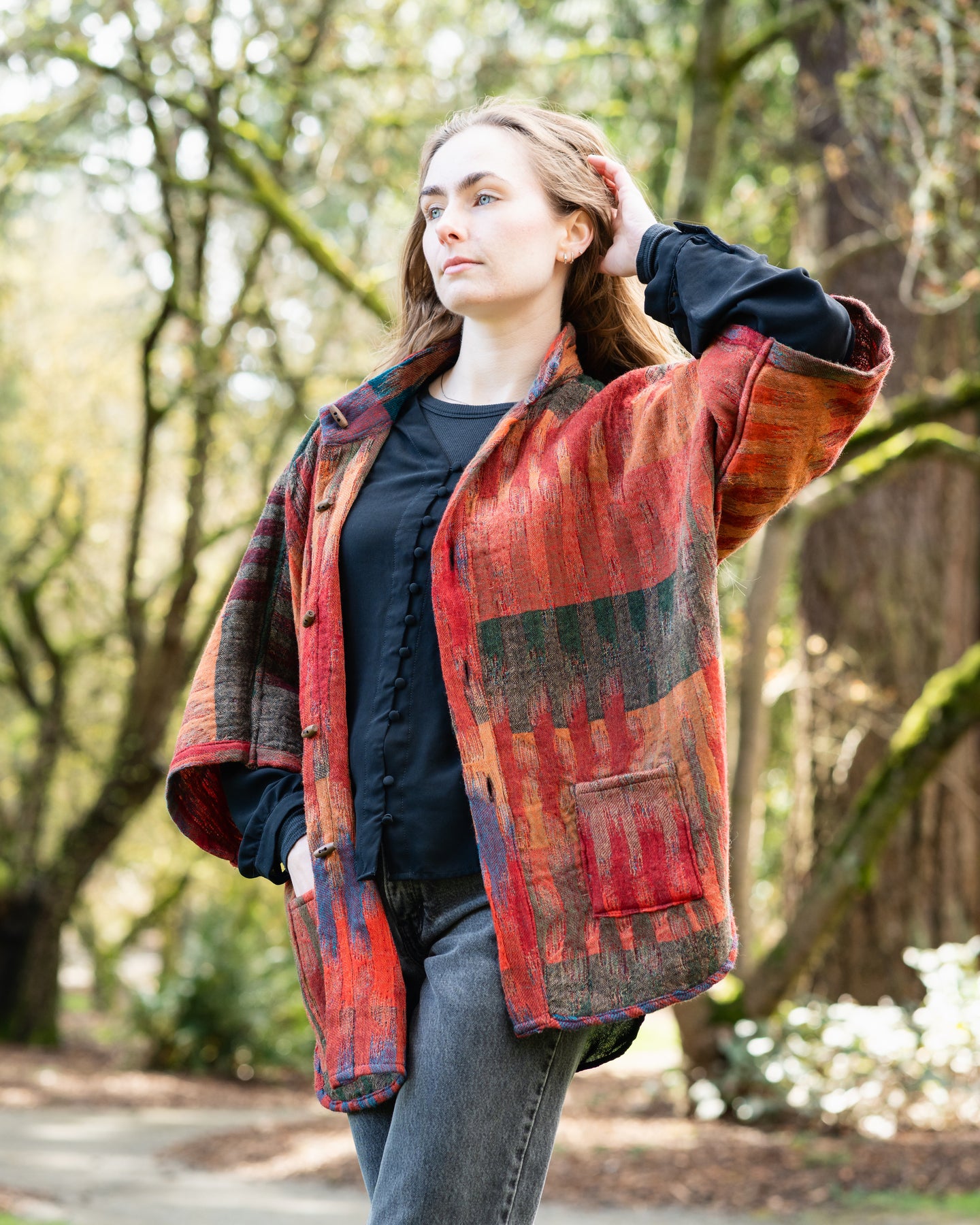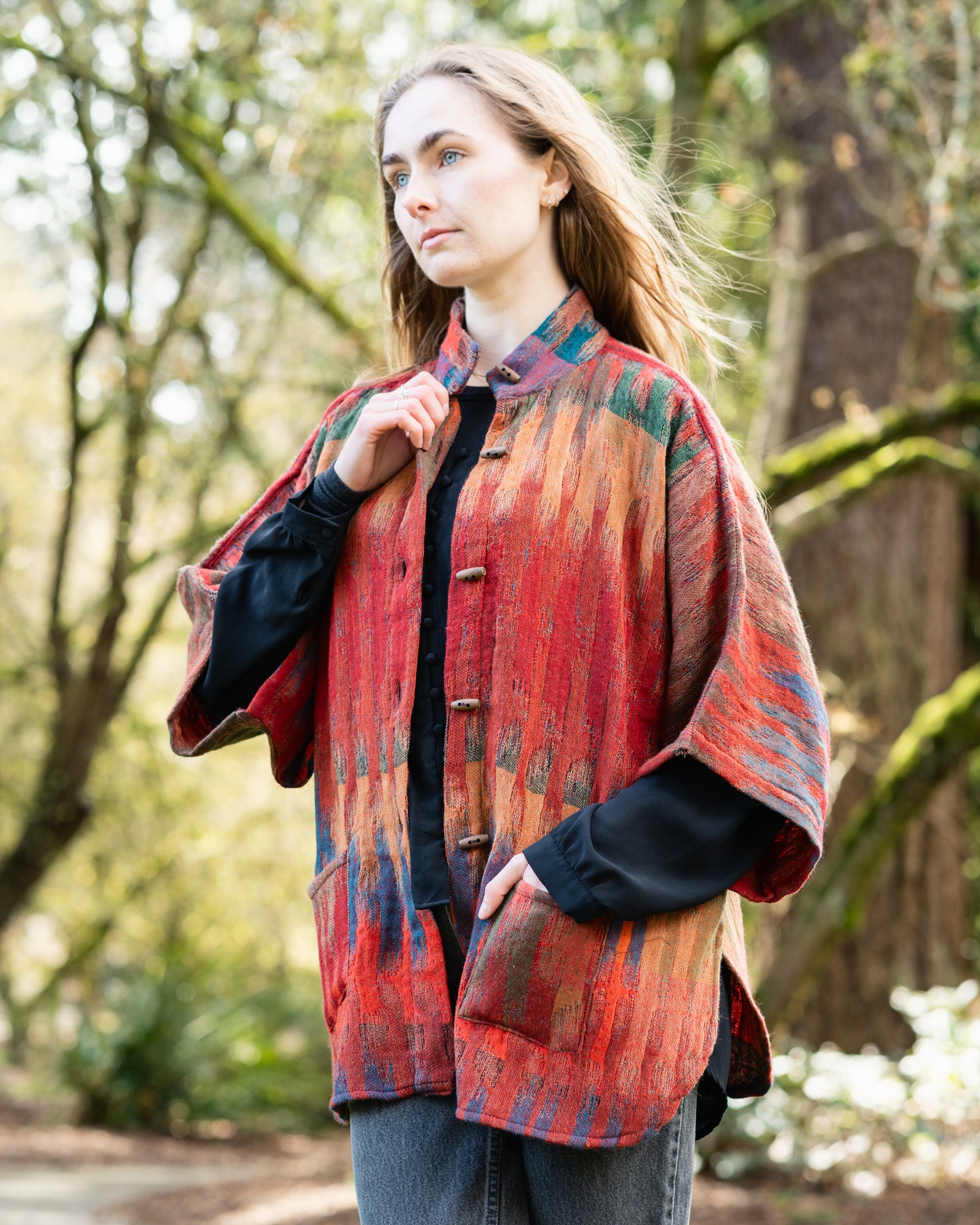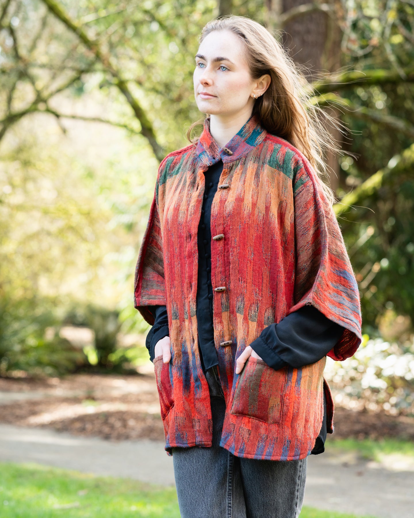 • Mandarin Collar: Features a sophisticated neckline and natural wooden button detailing.